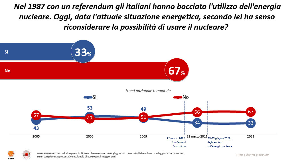 E’ da notare inoltre come la rilevazione del 2011 fosse stata effettuata poco giorni dopo il terremoto giapponese, ovvero quando ancora non erano chiari i dettagli e le conseguenze dell’incidente alla centrale di Fukushima. E’ molto probabile che la campagna mediatica che si scatenò nelle settimane successive, e che si protrasse fino al referendum del 12 e 13 giugno, abbia ulteriormente influenzato le opinioni dei cittadini, come peraltro attestato da una rilevazione condotta da DOXA nell’aprile di quell’anno e in cui i favorevoli all’energia nucleare venivano stimati in netta discesa, sotto al 25%.